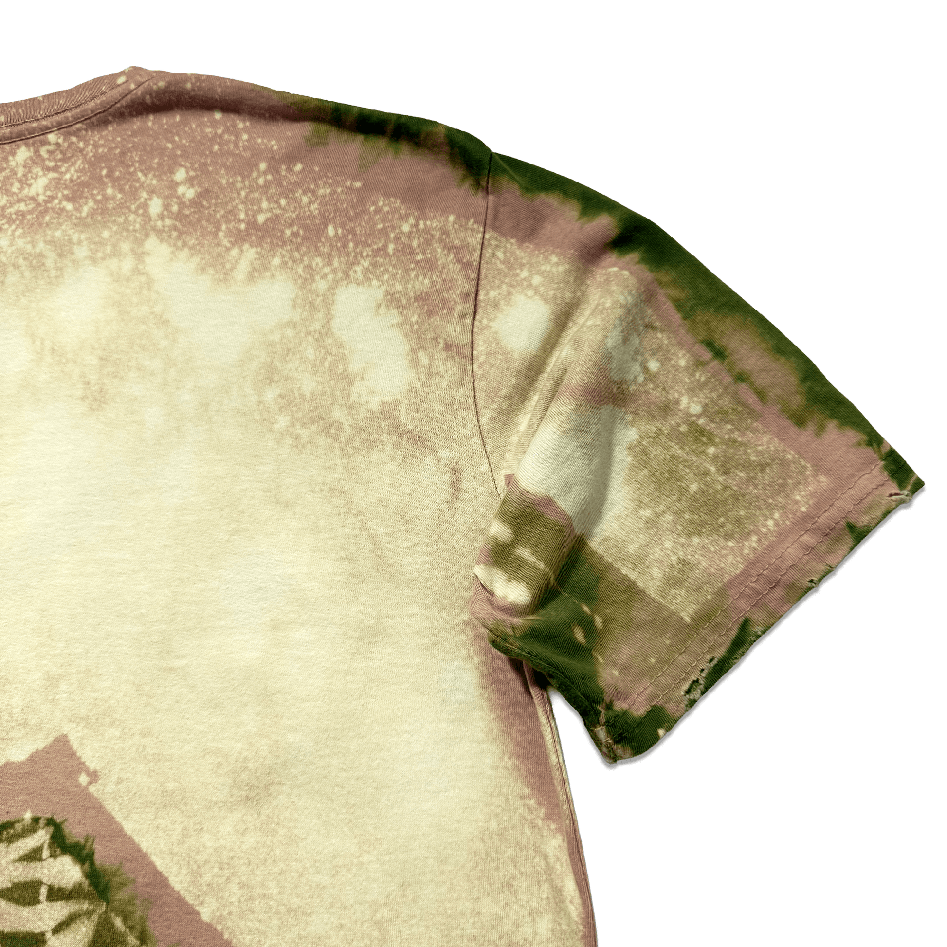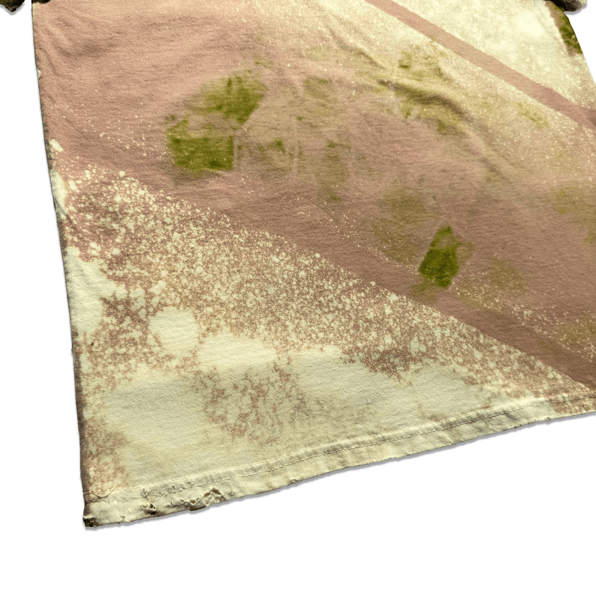 The FFF (Fly Flashy Fashion) “Desert Moss” T-Shirt is individually customized in-house, beginning with a tan dye base, followed by green tie-dye treatment and a bleach effect applied at the front and back. The signature airplane graphic is screen printed at the chest in red. At the back, the “Property of Flashy Fashion” logo is overprinted across the flip Flashy logo in yellow and red. Subtle distressing at the collar, sleeves, and hem completes the vintage-inspired finish. Constructed from 5.6 oz 100% combed ringspun cotton.