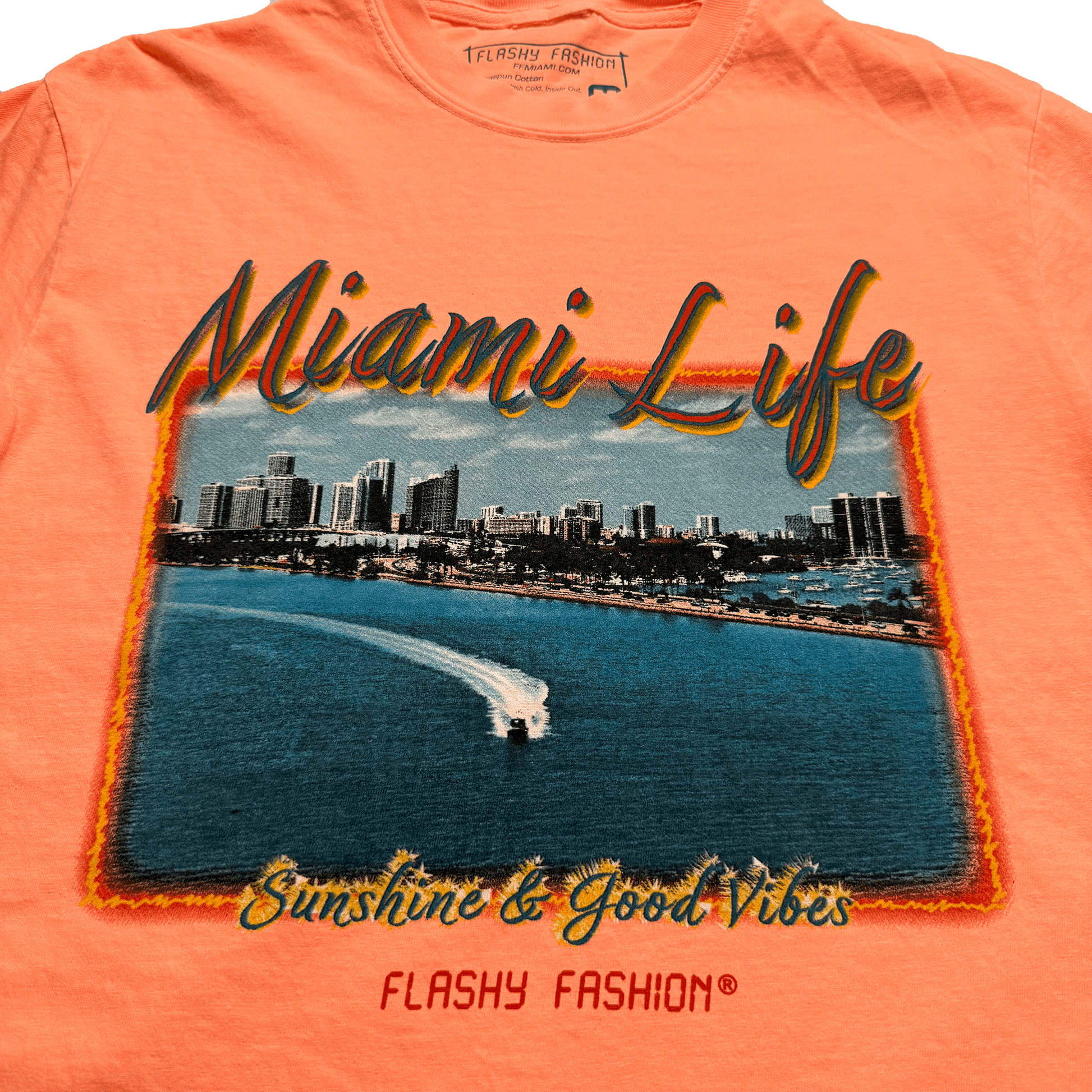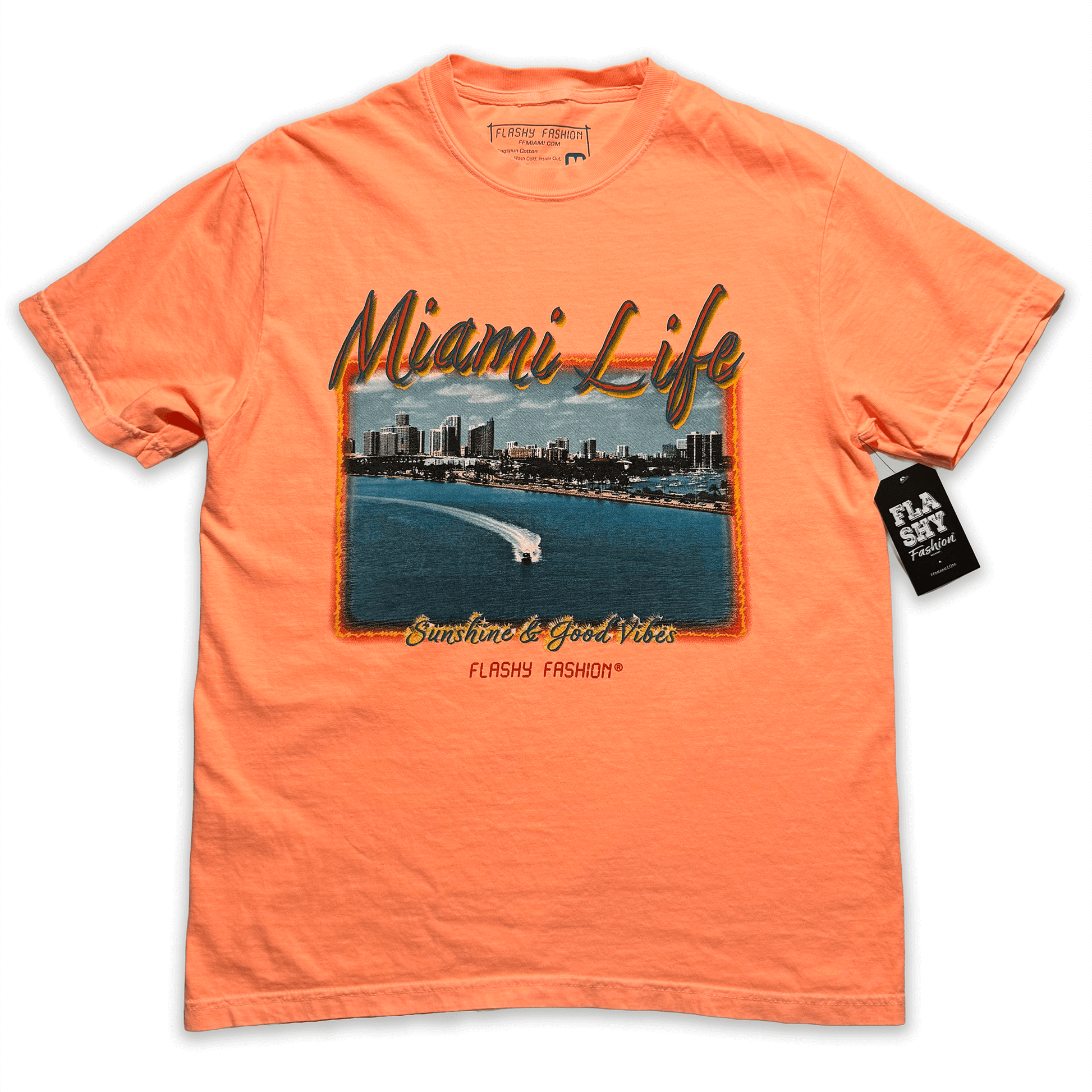 Our Miami Life Sunset Sorbet tee is constructed of heavyweight garment-dyed cotton for a premium feel. It features a screen-printed shot of the city’s iconic shoreline redesigned as a painting. Built on a premium blank with bold colors and classic coastal energy, this one’s made to stand out—just like the city it reps.