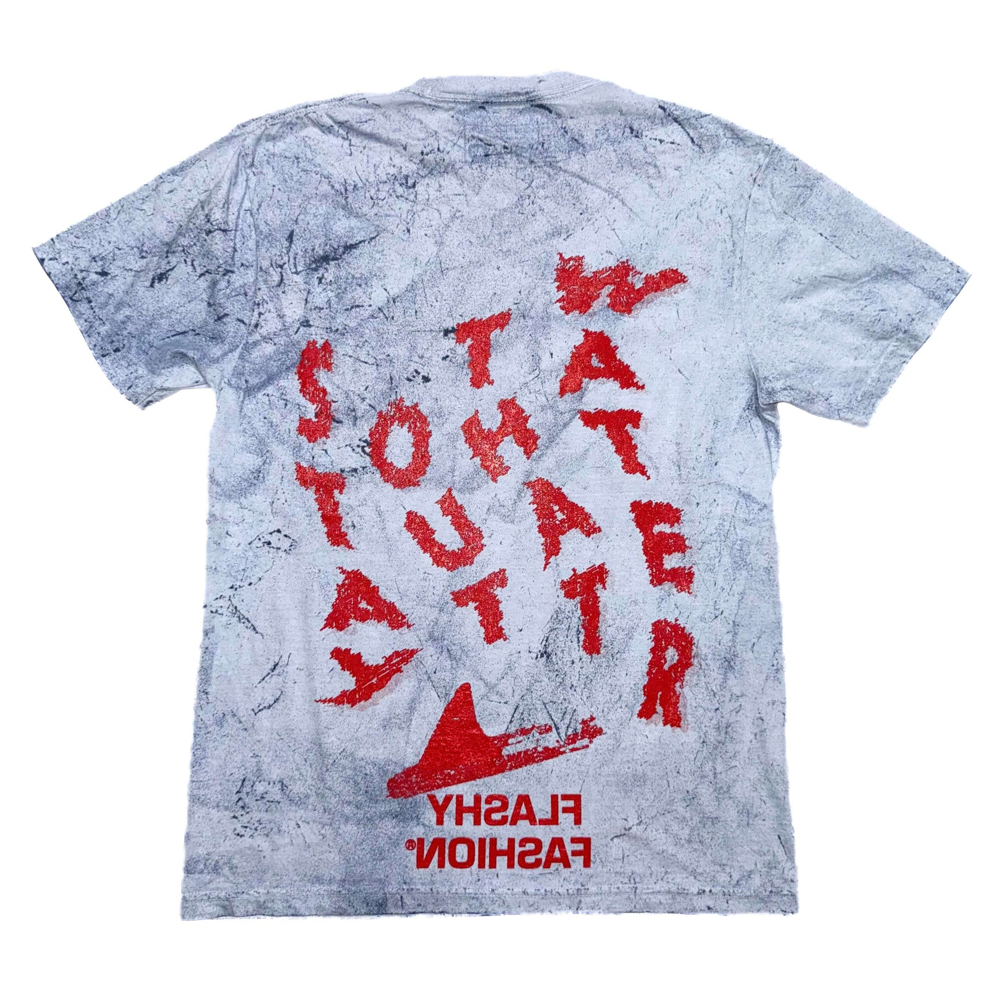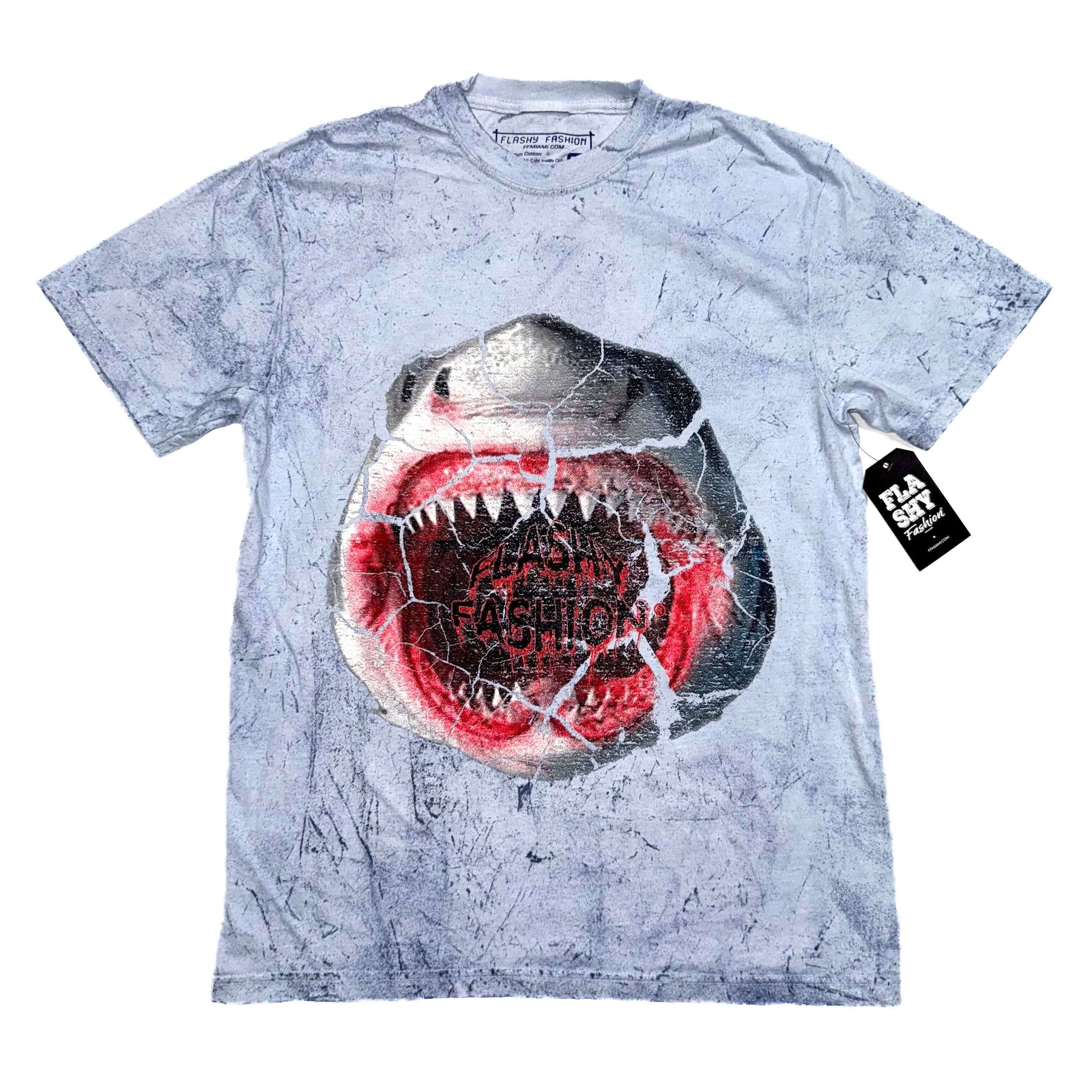 A 6.1 oz. heavyweight ring-spun cotton t-shirt featuring a garment-dyed finish and bold crack-print artwork. Shark face vintage-style graphic on the front. "Stay Out That Water" design & Flashy Fashion shark fin graphic on the back.