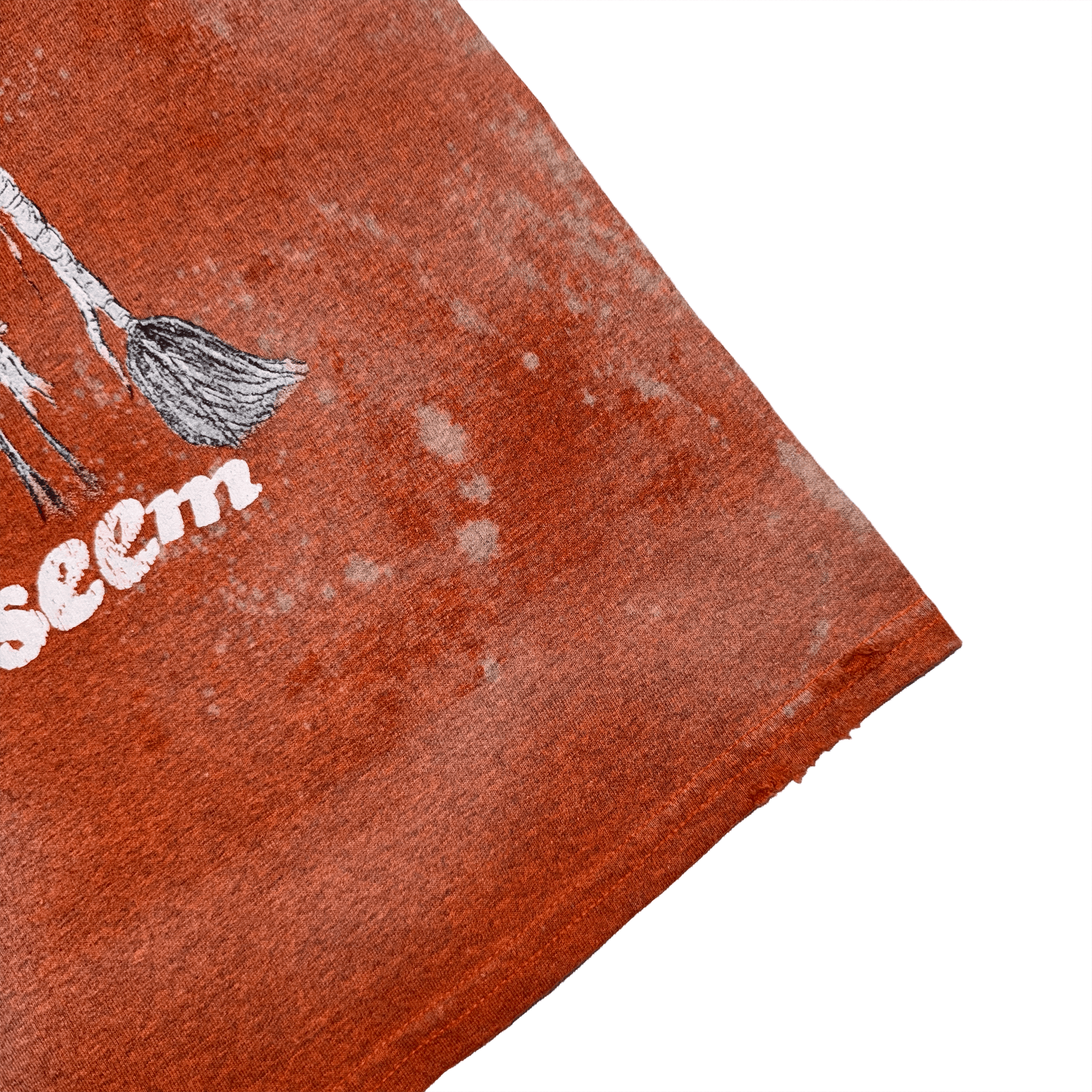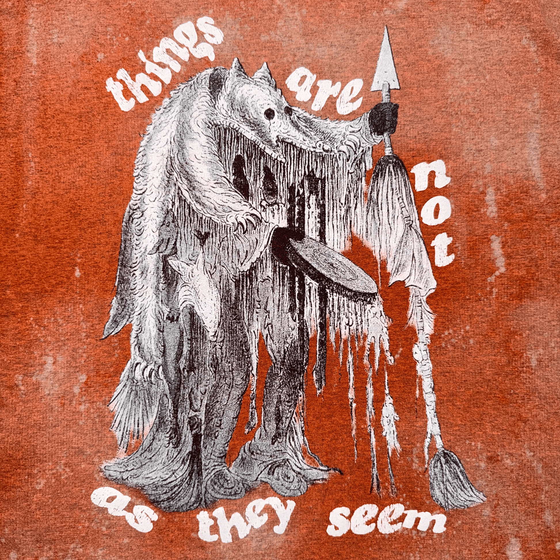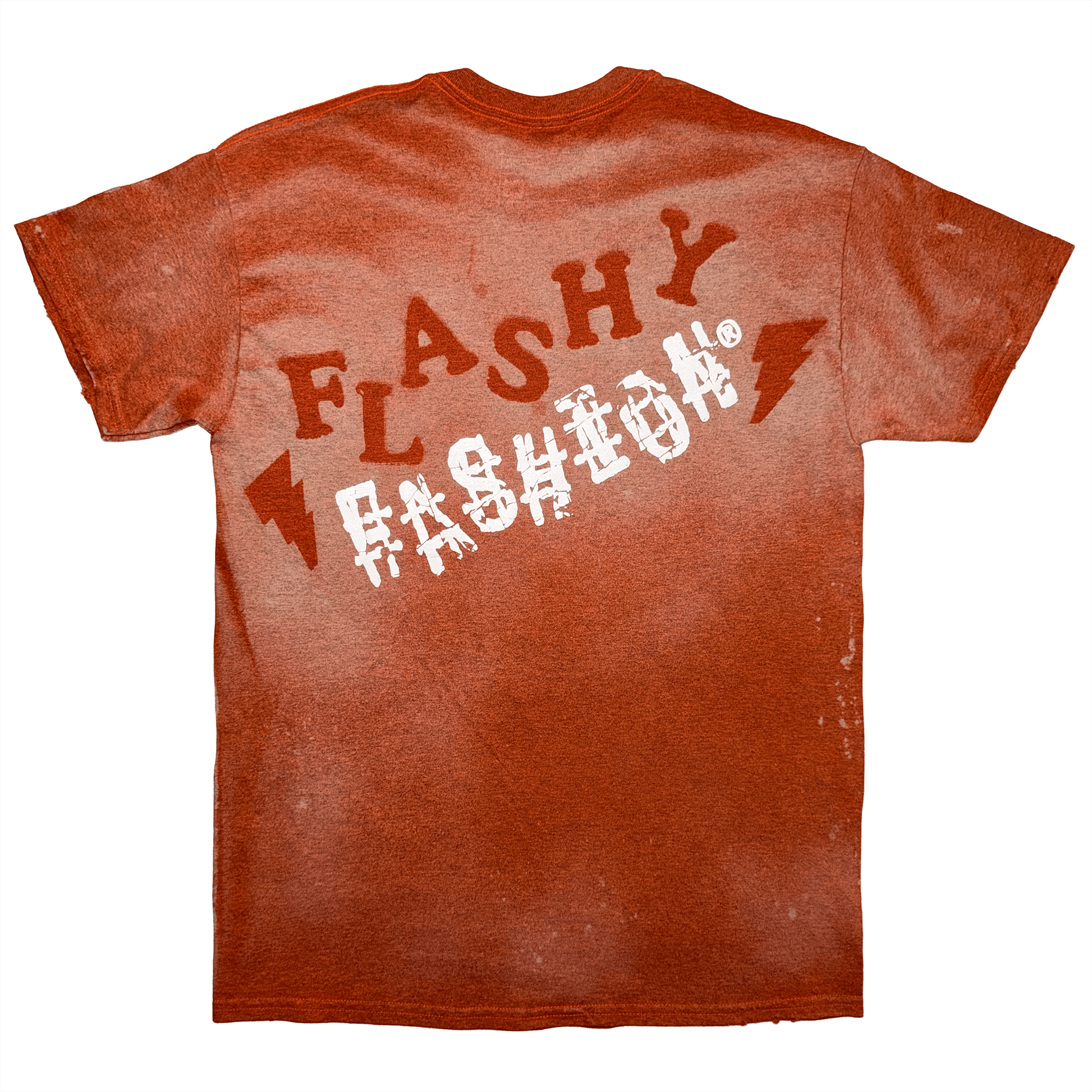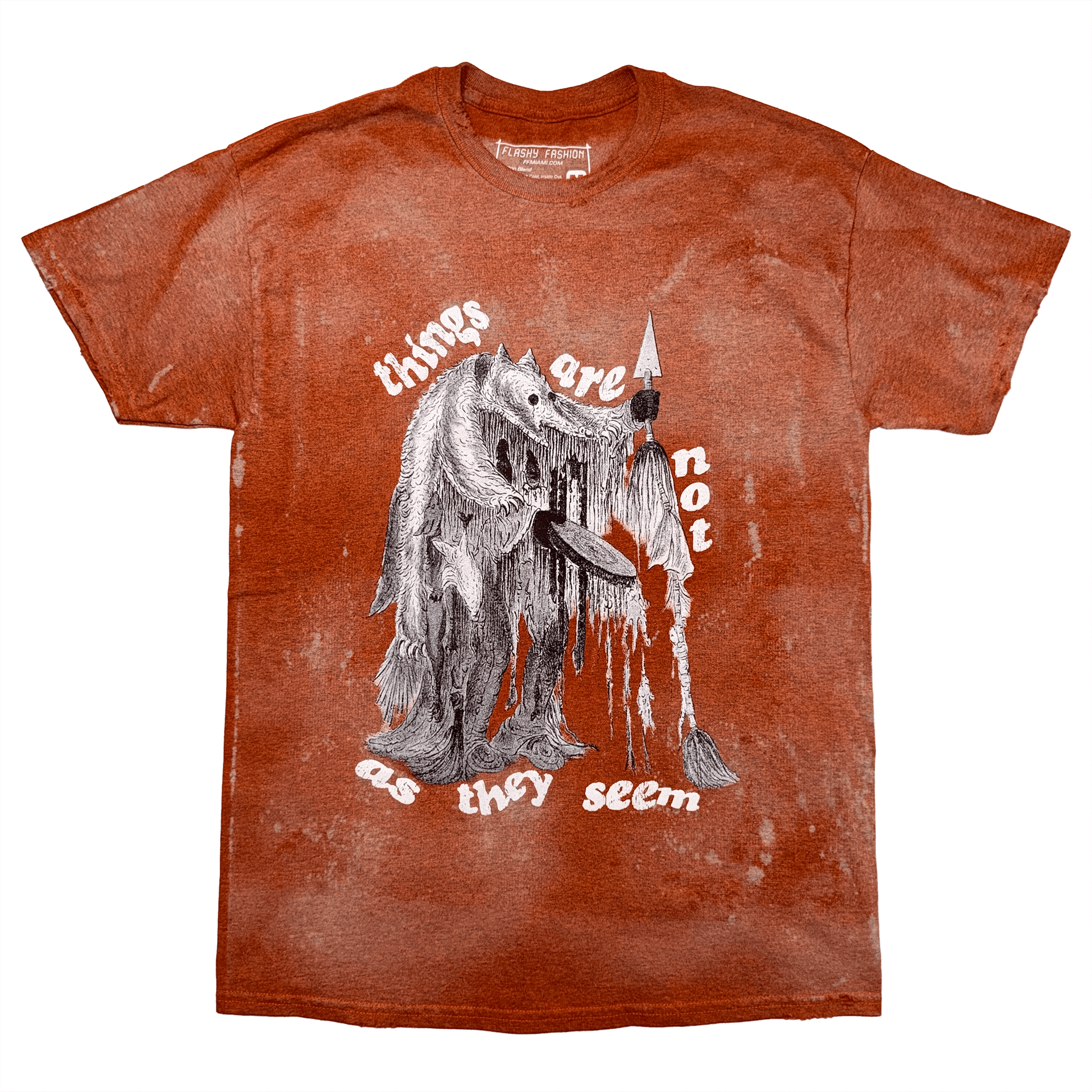 “Things Are Not As They Seem” Limited Edition T-Shirt features a custom splatter wash process that was produced in-house. Each t-shirt features a screen printed graphic of a medicine man wearing a bear skin with the “Things Are Not As They Seem” quote on front. The back features Flashy Fashion with Fashion screen printed in white. Each t-shirt is heavyweight 5.3 oz. cotton in burnt orange. Some distressing on collar, sleeves & hemline. Each tee is uniquely different due to wash & design.