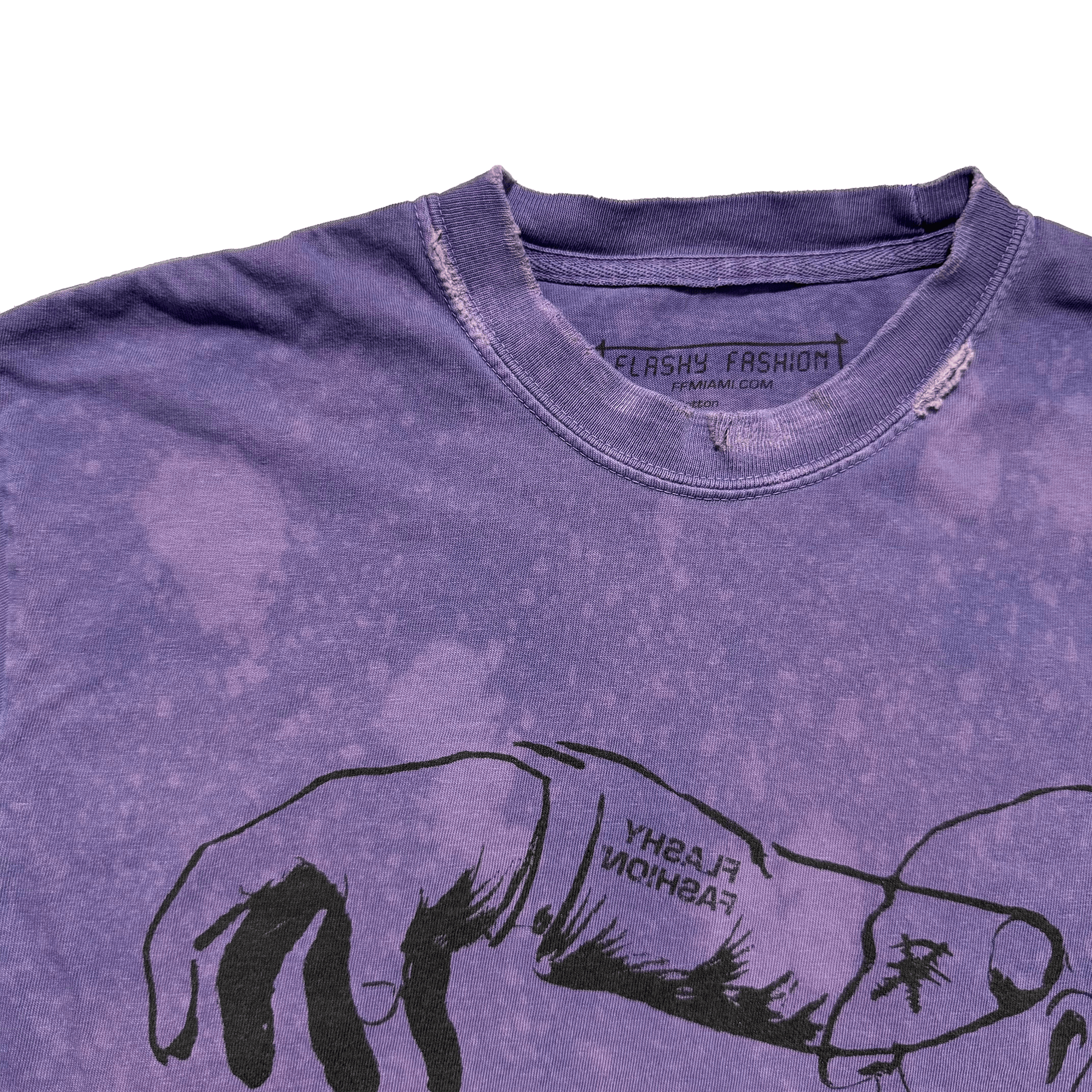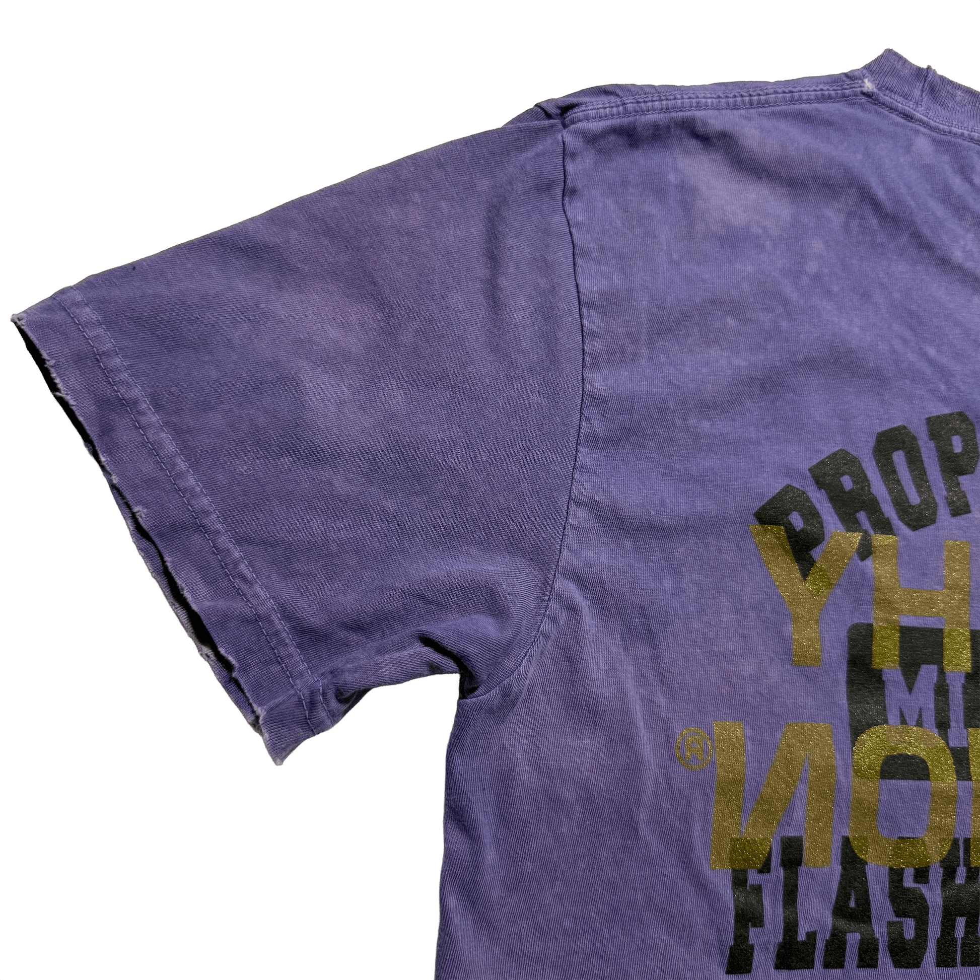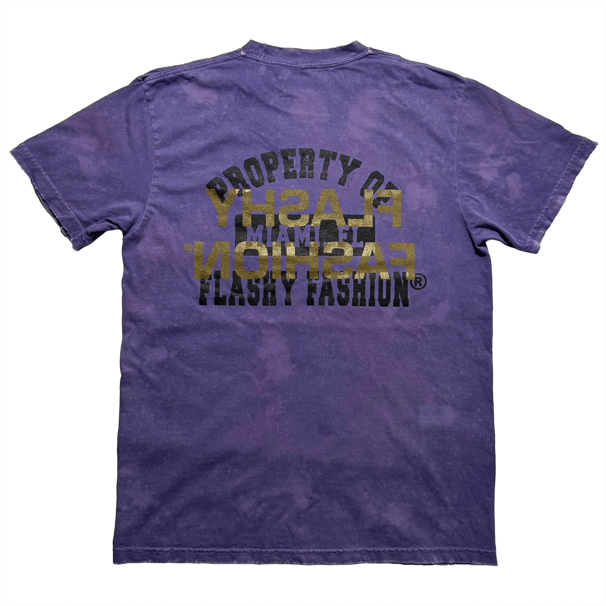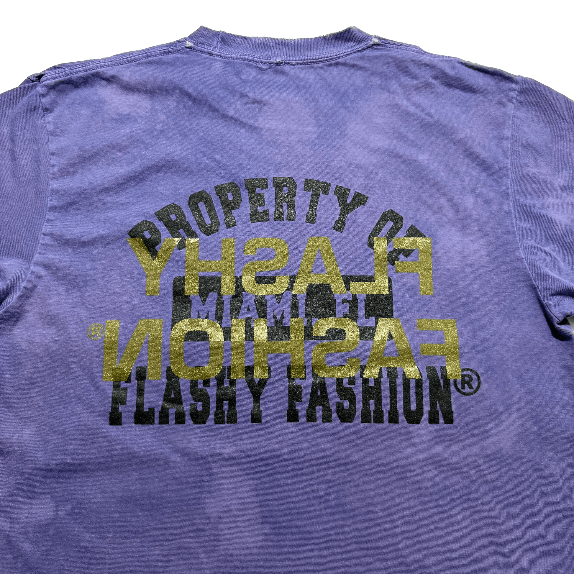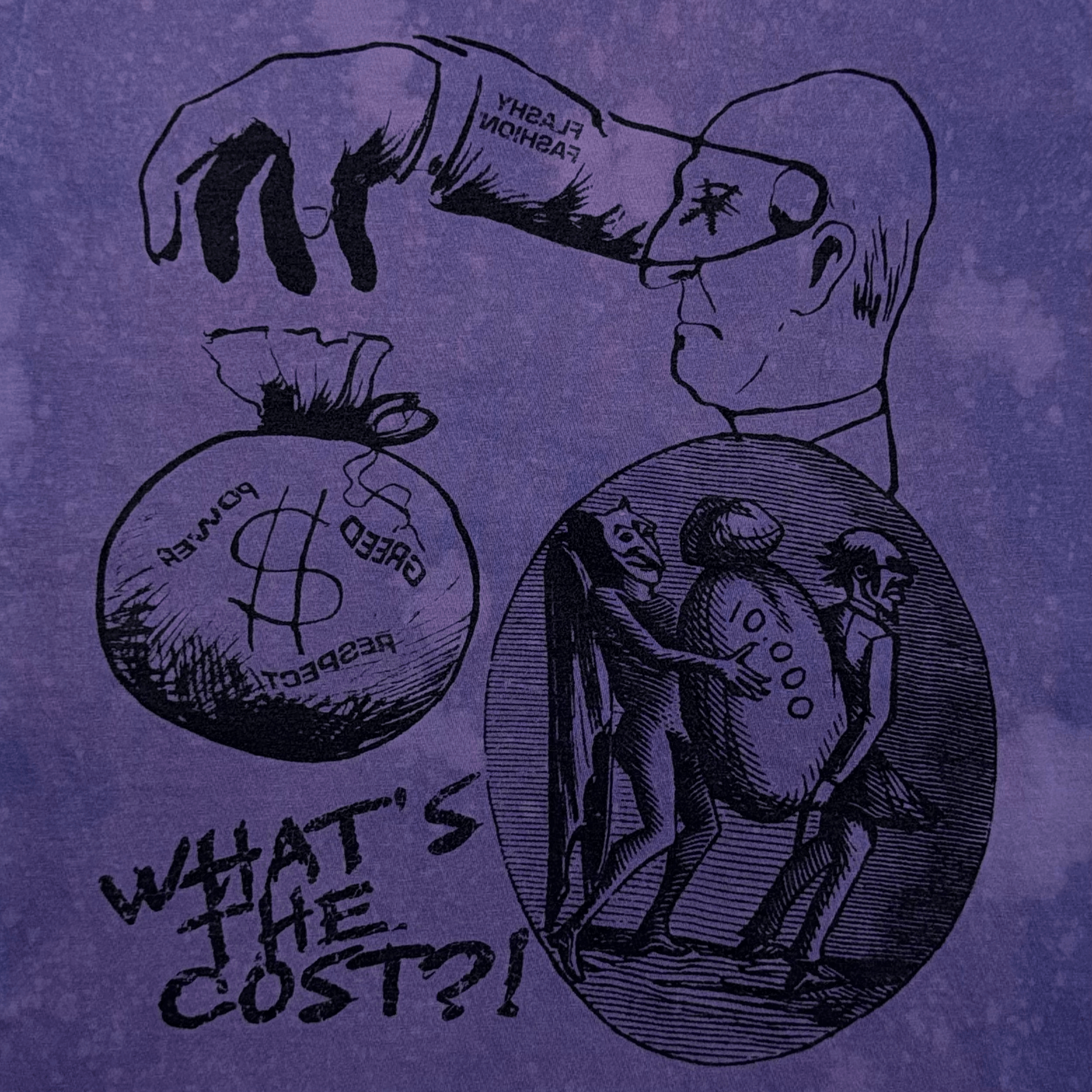 The What’s the Cost?! T-shirt is crafted from 6.1 oz 100% ringspun cotton for lasting comfort. It features a custom vintage wash created in-house, blending dark purple, light purple, and royal blue for a unique faded look. Each shirt is one of a kind, with the What’s the Cost?! design screenprinted on the front and the Property of Flashy Fashion logo with an overprinted flip Flashy logo on the back. Subtle distressing on the collar, sleeves, and hem adds an authentic vintage touch.