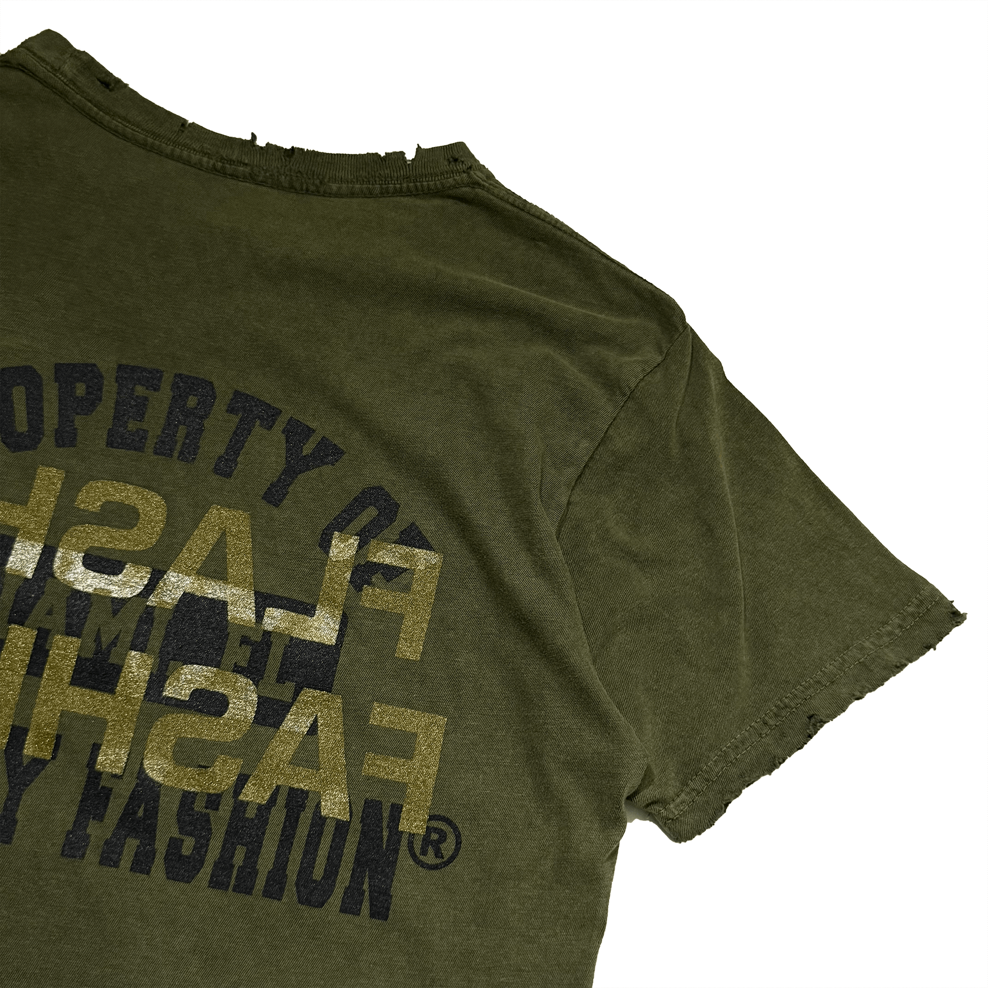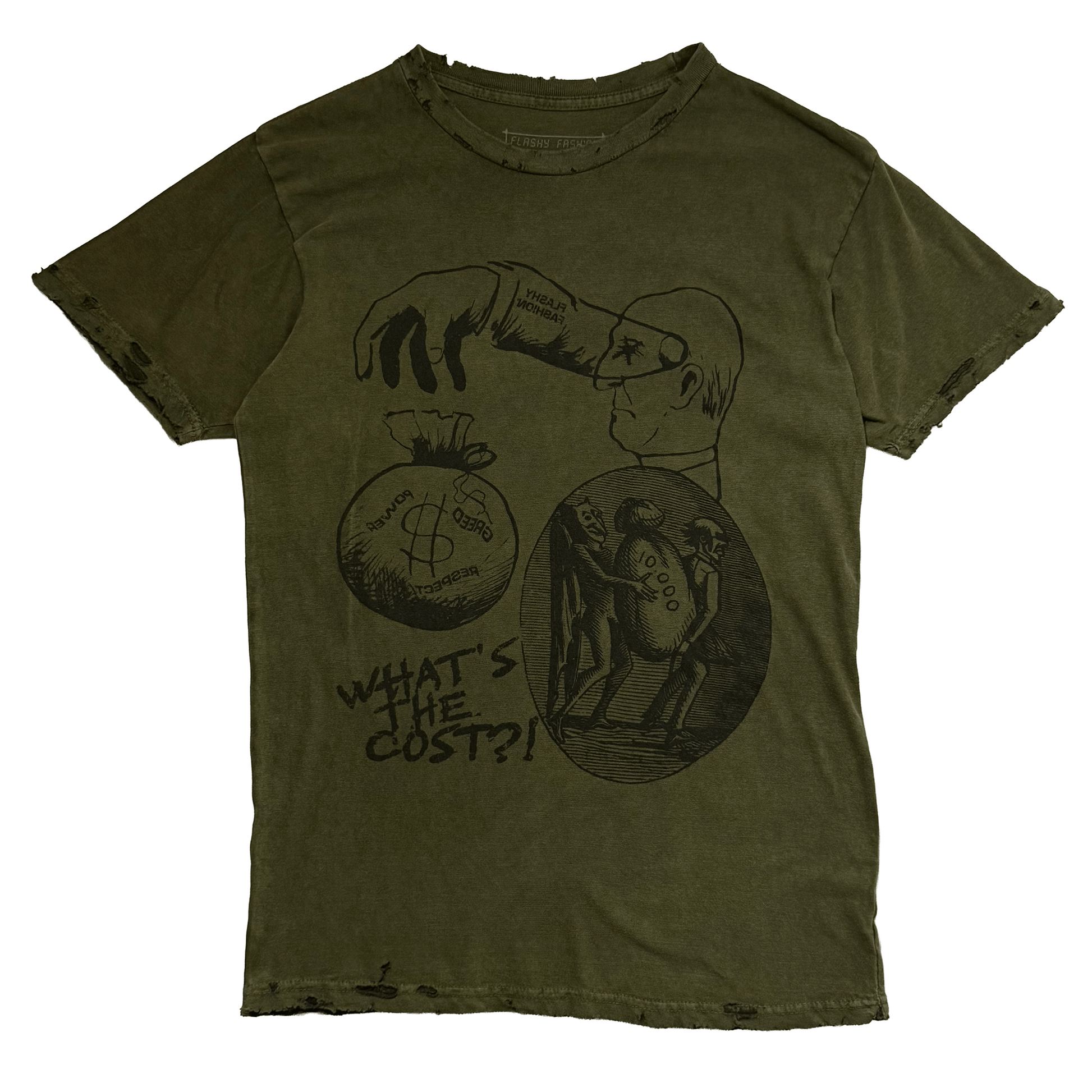 The “What’s the Cost?!” Old Money Green T-Shirt is crafted from 4.2 oz combed and ring-spun cotton in an olive vintage wash inspired by classic old money tones. The “What’s the Cost?!” artwork is screen printed at the front, while the back features the “Property of Flashy Fashion” logo layered over the signature flip emblem. Heavy distressing at the collar, sleeves, and hem completes the vintage finish. Due to the wash process, each garment carries subtle variation in tone.